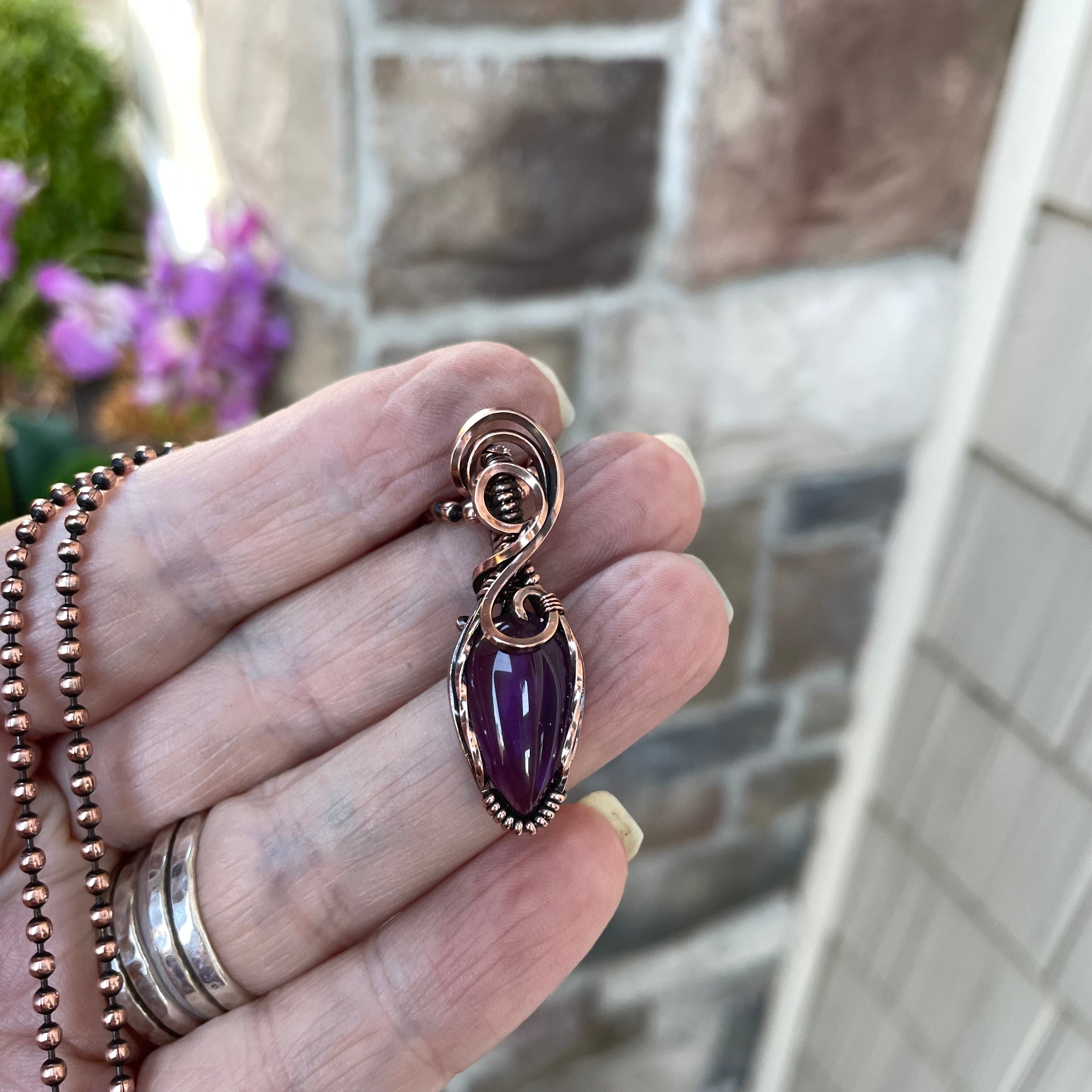 A lovely amethyst in a nice small size with a flowing swirly design. The copper wire has been oxidized for an antique look.