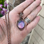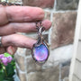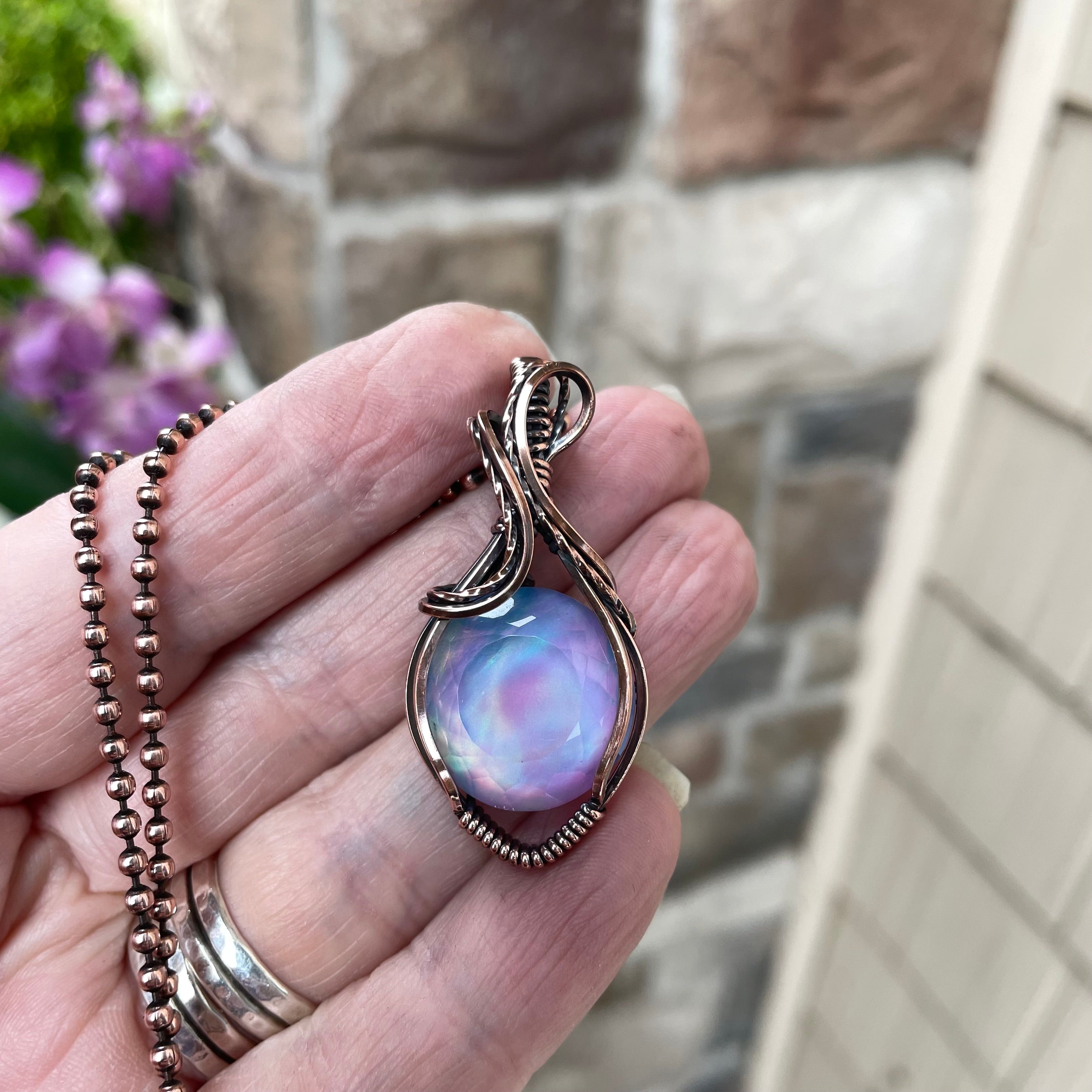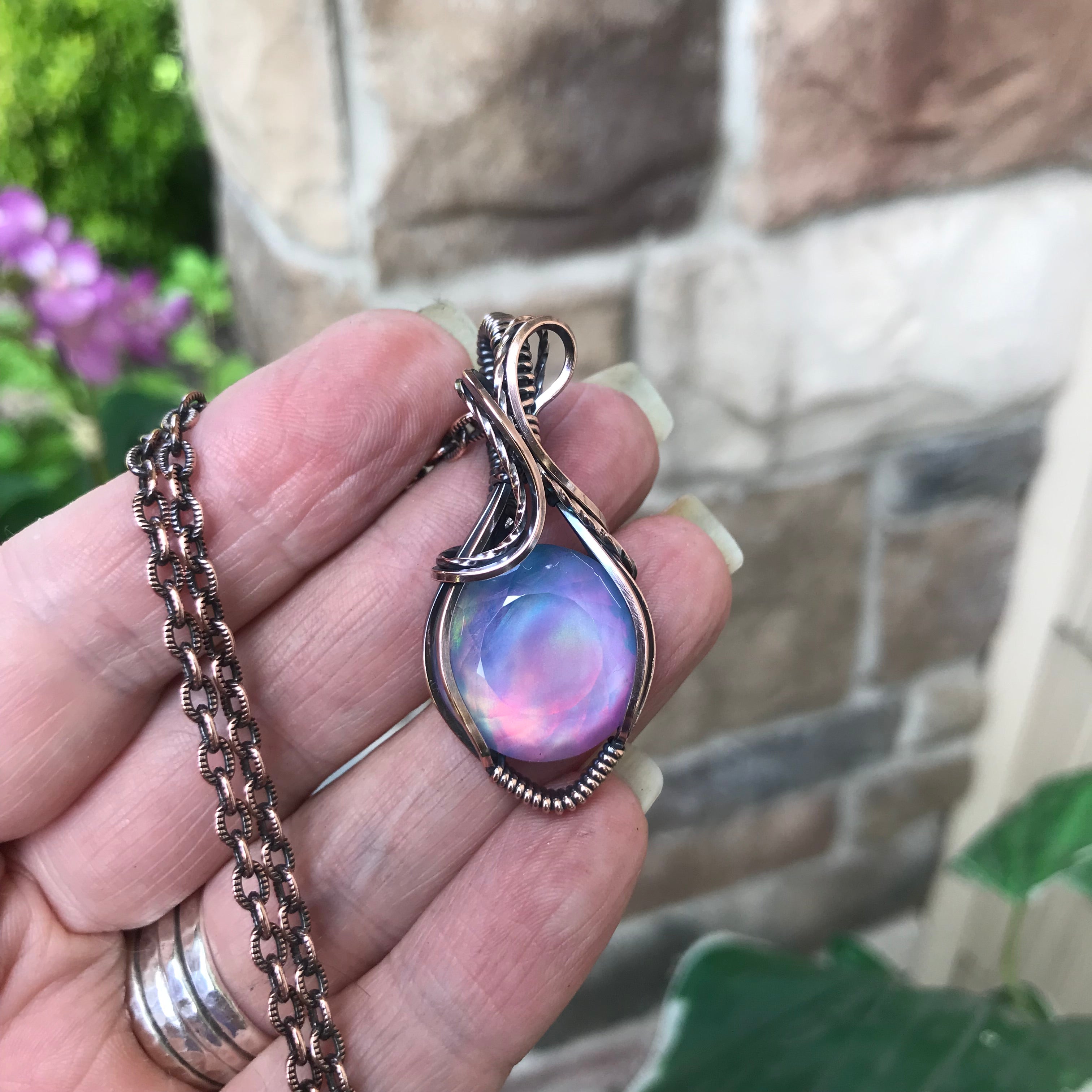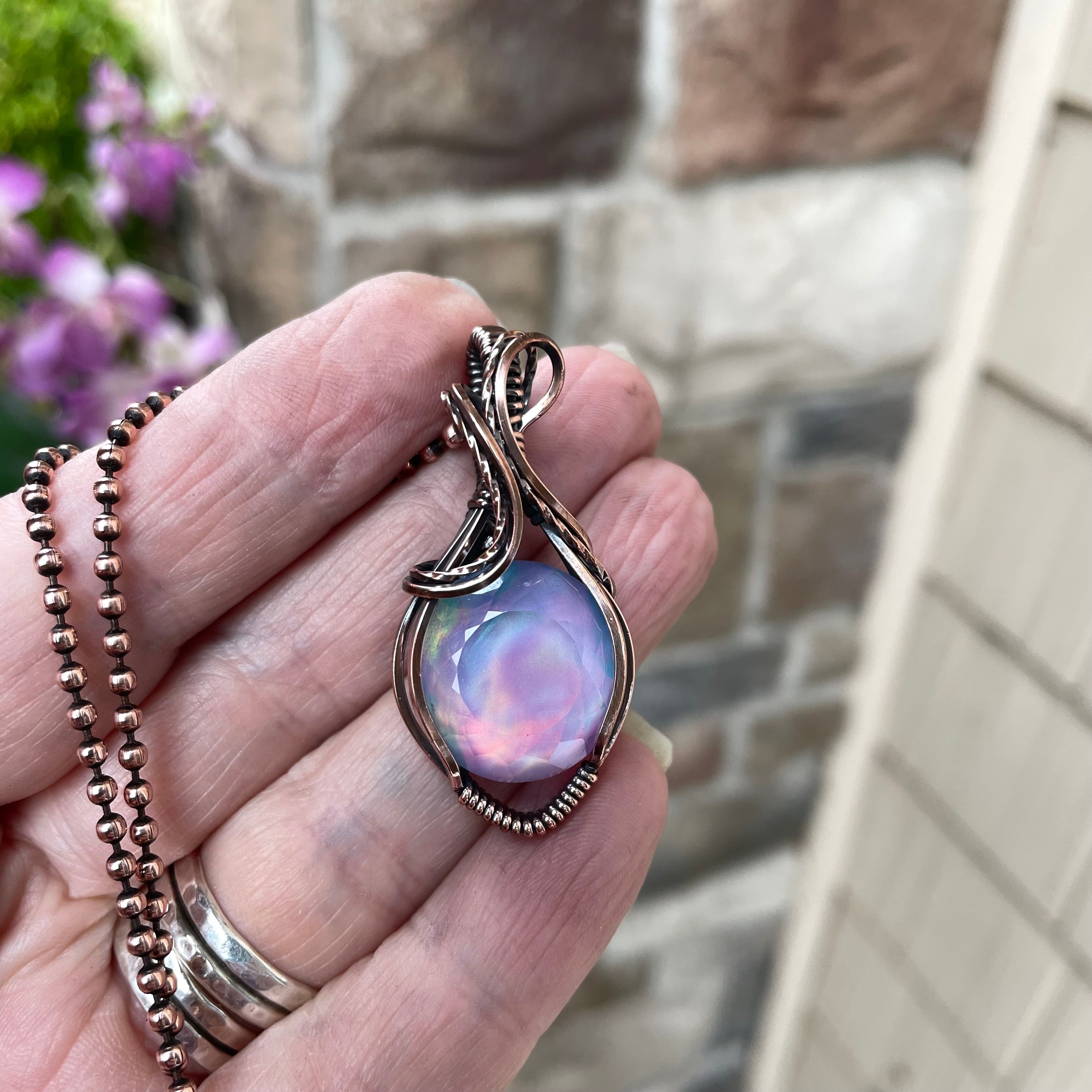 A beautiful faceted aurora opal with a pastel rainbow blend of colors. Pink and purple are featured when turned around. It is accented with an S-shaped swirl design and twisted wire for extra sparkle. The copper is oxidized to give an antique, vintage look.