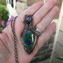 A stunning green & blue azurite in copper measuring 2 3/4 x 1 1/4 inch. It has a kyanite accent stone nestled in the woven bail at the top The splashes of blue in the stone go so well with the dark blue of the kyanite! I love the combo!