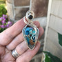 A lovely shattuckite wire wrapped pendant in sterling silver. It measures 2 x 1 inches. I've added a smoky quartz accent and a swirly design. I've left the silver shiny and unoxidized.