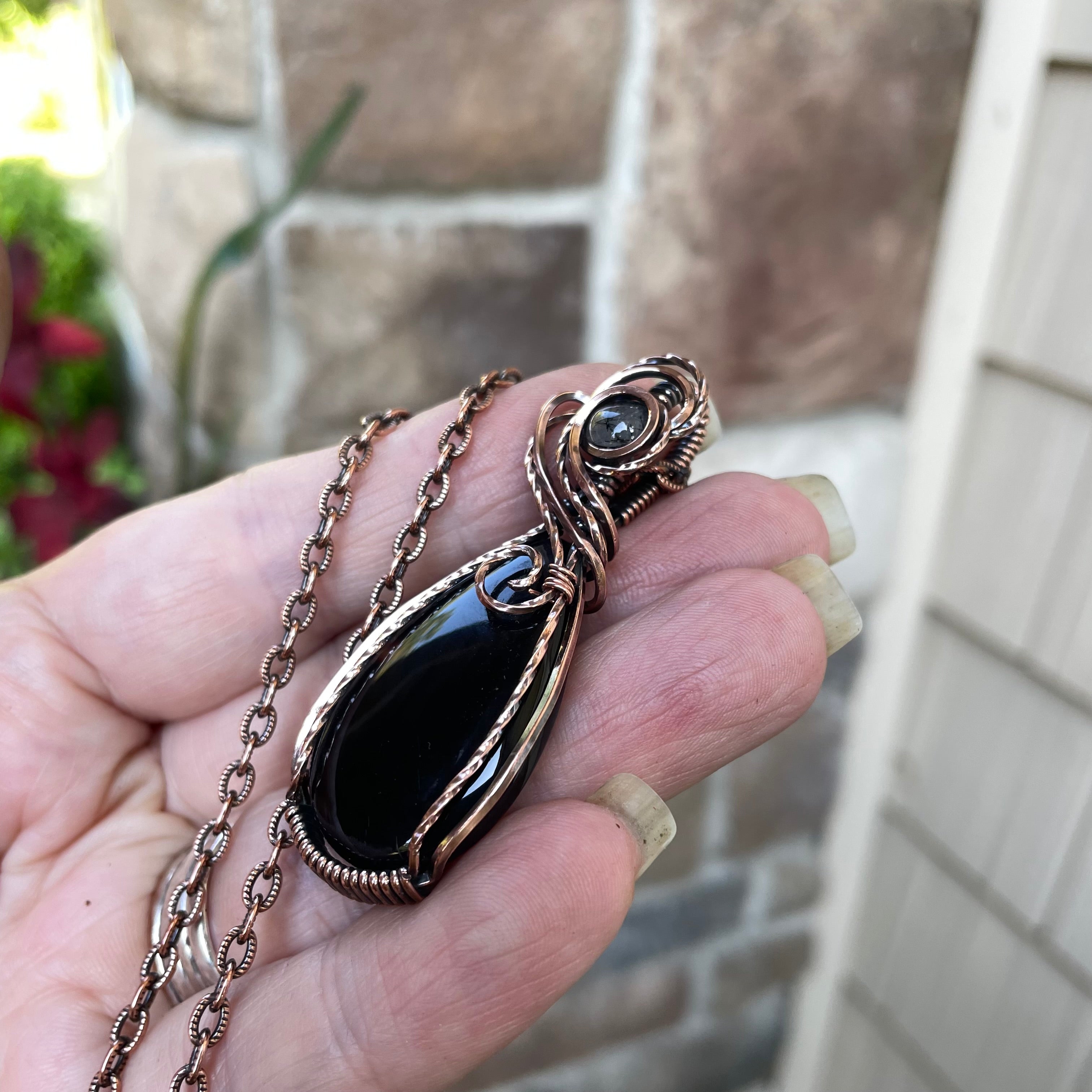 A rich dark black onyx in copper measuring 2 1/4 x 1 1/4 inch. I’ve added a black rutilated quartz accent and my favorite swirl design. The copper is oxidized (darkened) and gives off an old world antique look.