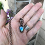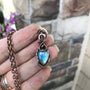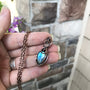 A vibrant high grade mini blue labradorite that measures 1 1/4 inches by 1/2 inch.. Small swirls and curves wrap around the top. The copper wire has been oxidized for an antique look and to give much depth and character.