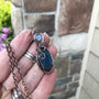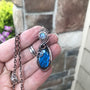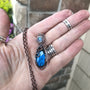 A beautiful small blue labradorite that measures 1 3/4 inches by 1/2 inch. A moonstone accent with teal blue shades is nestled in the swirls and curves that wrap around the top. The copper wire has been oxidized for an antique look and to give much depth and character.