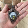 This is a stunner! A vibrant blue and purple labradorite with a splash of rainbow colors like green and orange. I’ve framed it in a patterned wire weave and it measures 3 1/2 inches x 2 inches.