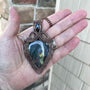 The bail (where the chain goes through) is woven and I've added a matching blue labradorite accent nestled in. The copper is oxidized to give an antique, vintage look.