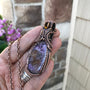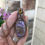 A gorgeous oval charoite with a sparkly honey citrine accent nestled in with the woven bail (where the chain goes through.) This pendant measures 2 3/4 x 1 inches wide. Textured curves adorn the top. The copper has been oxidized (darkened) and polished for an antique look.