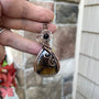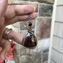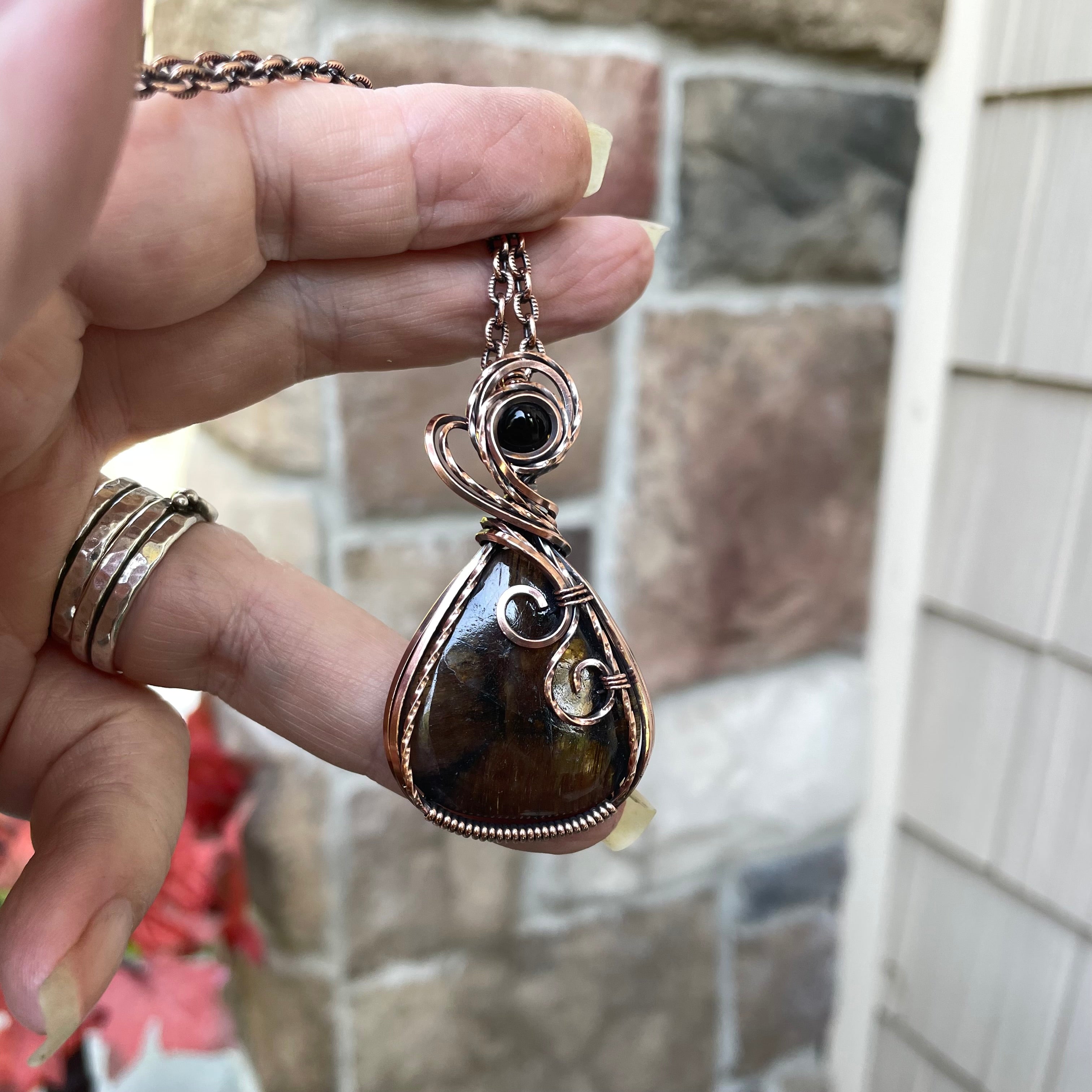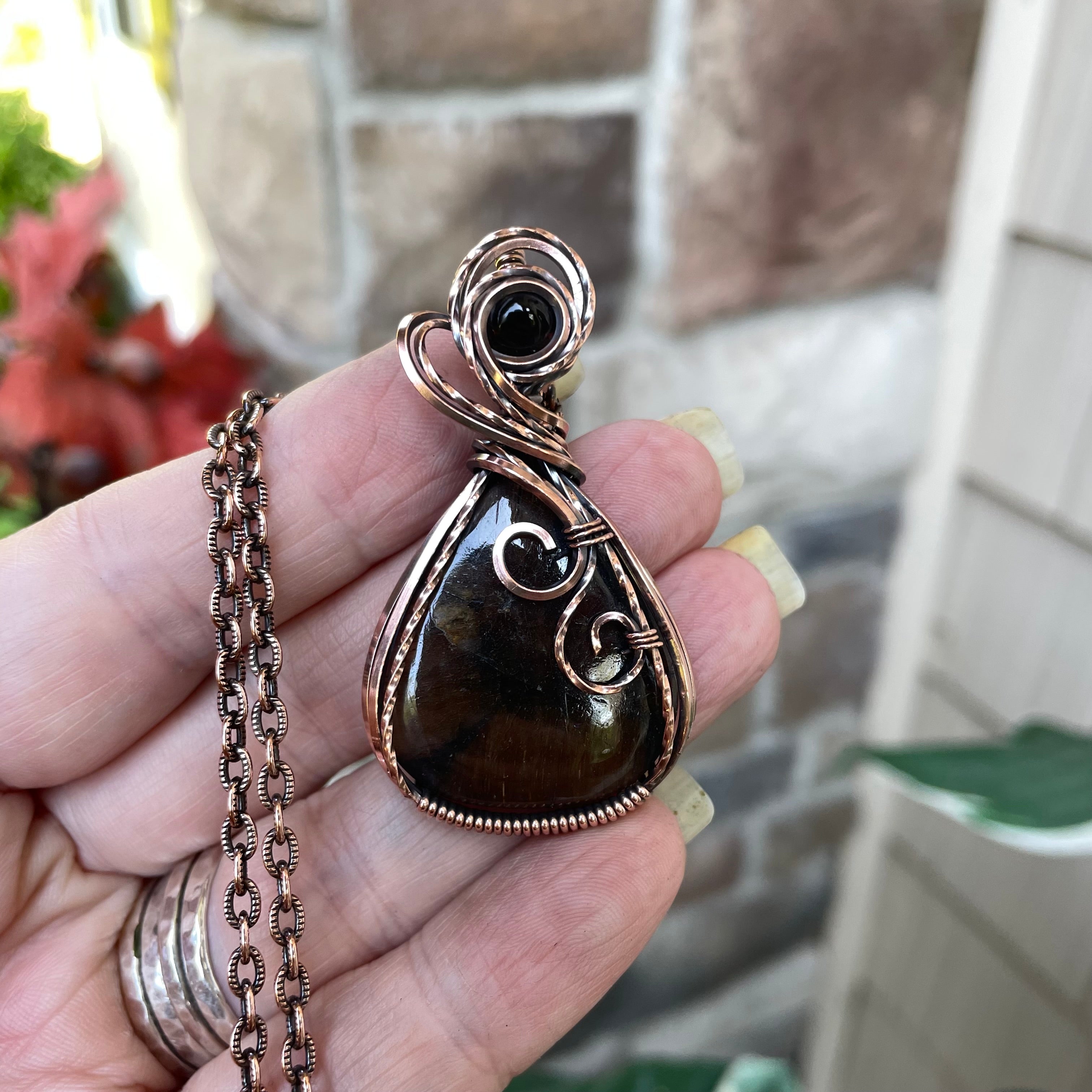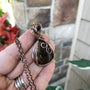 I've added a smoky quartz nestled in with the swirl design and the twisted wire on the front adds sparkle. The oxidized copper gives an antique, vintage look.