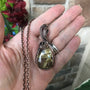 Copper chains: I buy these 99.9% copper chains raw and shiny so I can oxidize and polish them myself. This way the antiqued color matches the pendant perfectly instead of being too orange if they are copper-plated.
