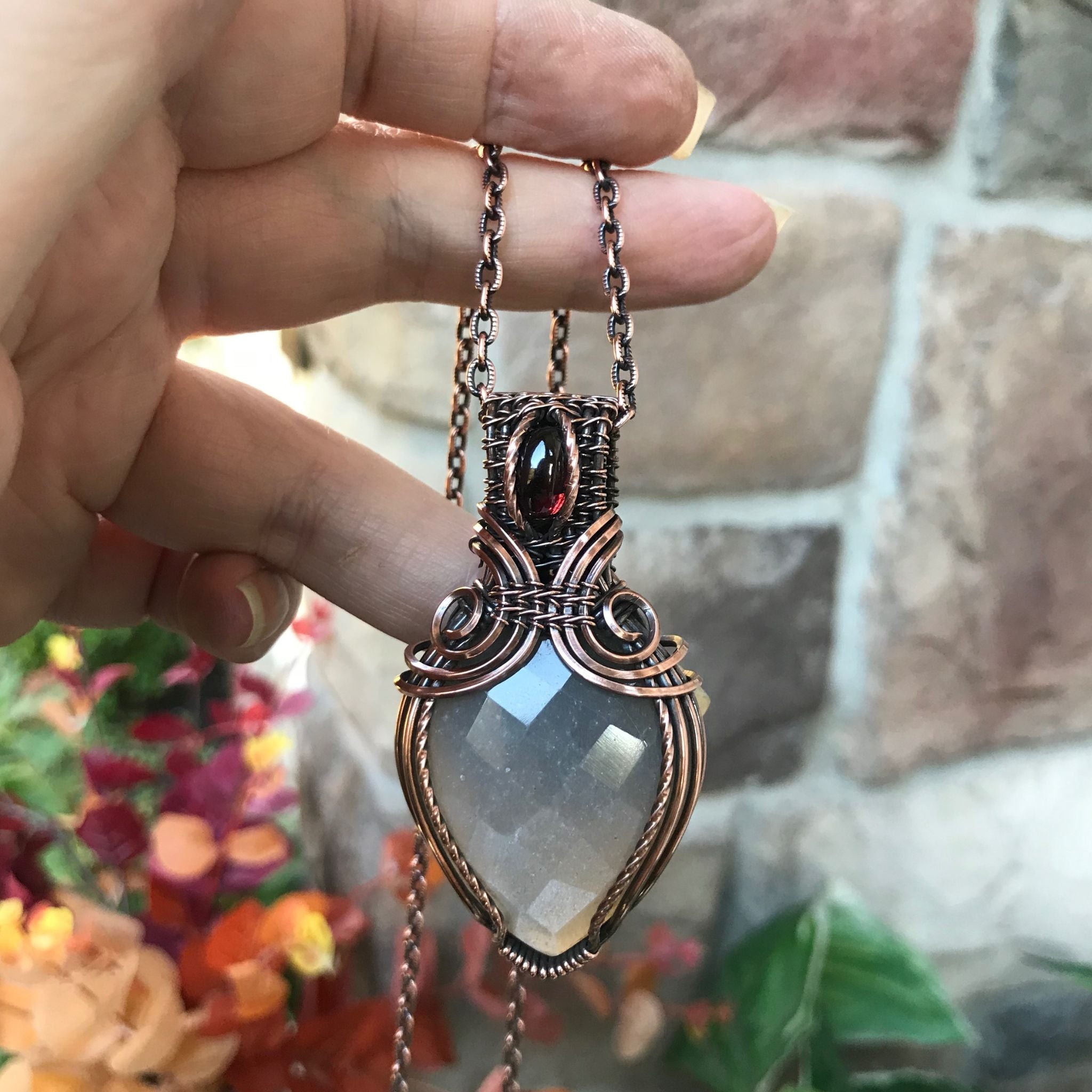 A stunning faceted gray moonstone with a garnet accent at the top, nestled in with the woven bail. Curves drape down with swirls in the middle. It has a slight heft to it, being a thicker stone (weight 1.1 oz.) Copper lines along the sides look extra good on stones like these. Twisted wire gives extra shimmer.