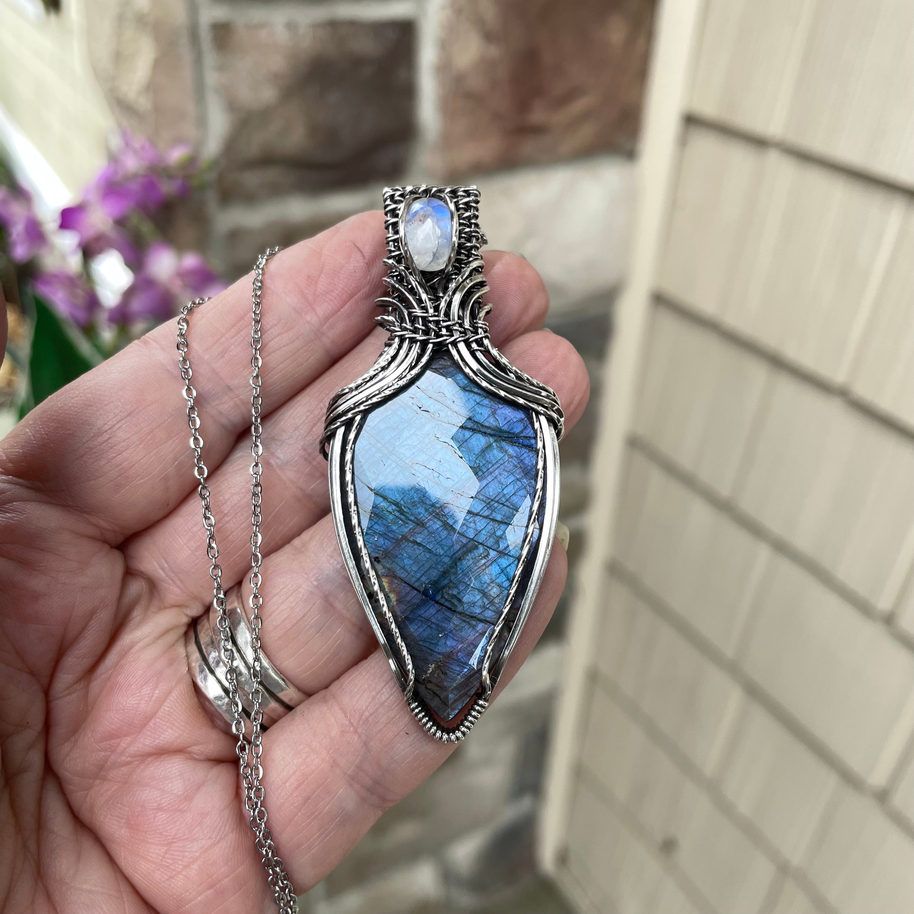 This is a stunning indigo colored faceted labradorite with a moonstone accent. This pendant measures 3 x 1 1/4 inches wide.