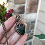 A beautiful dark green and black Kambaba jasper pendant measuring at 2 inches tall and 1 inch wide with oxidized copper chain options included. I've added a light green prasiolite accent inside the swirly design at the top. Twisted wire adds decorative sparkle.