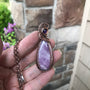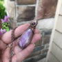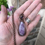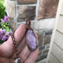 This is a soothing lavender colored kunzite (actually called "pink kunzite") I've added an amethyst accent at the top within the swirls. The copper is oxidized to give an antique, vintage look.