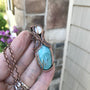 This is a beautiful and soothing larimar with a Mother of Pearl accent nestled in the woven bail (where the chain goes through.) It measures 2 1/4 inches by just under 1 inch.