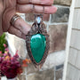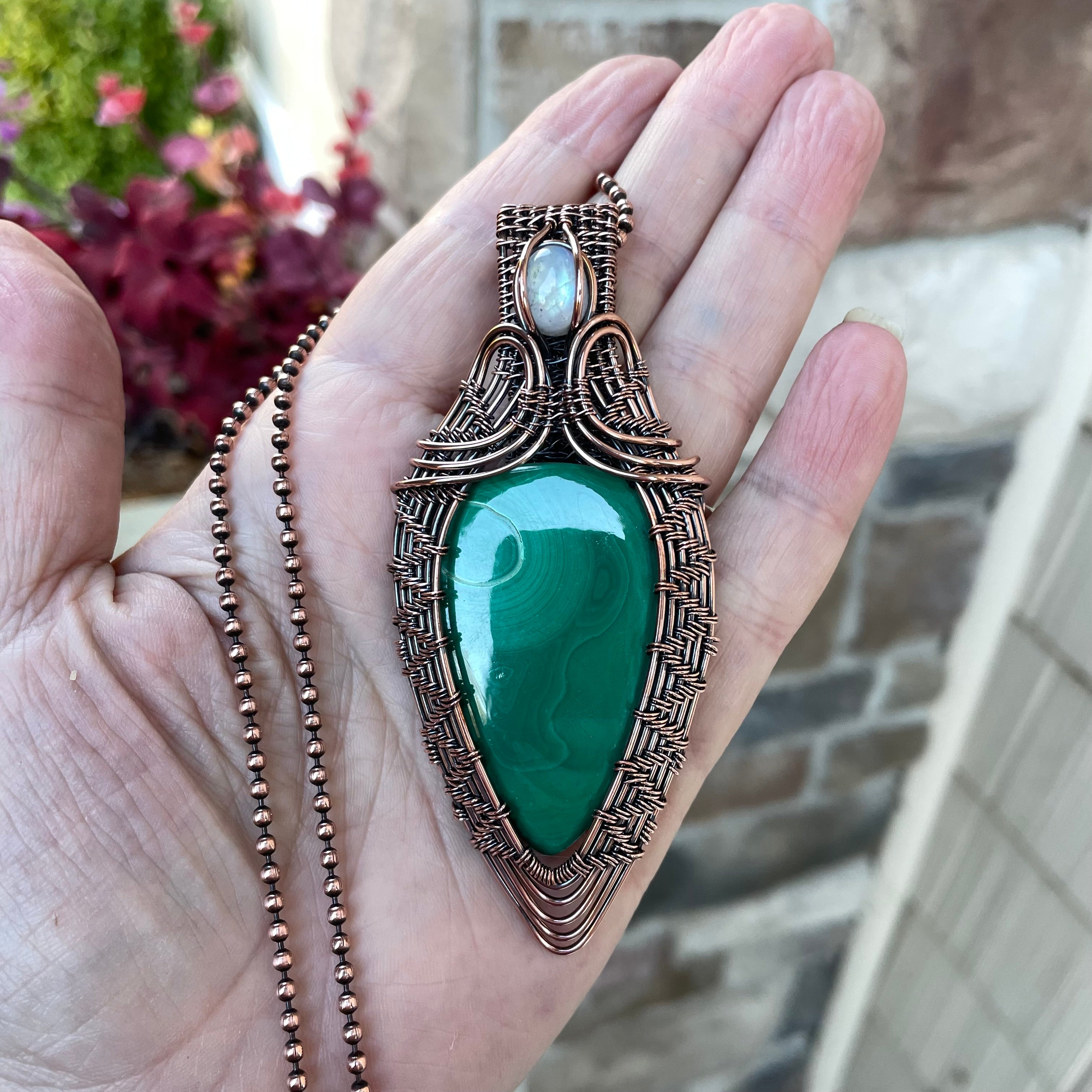 A beautiful malachite with a moonatone accent that measures 3 inches tall and 1 1/4 inch wide. It is framed in a thick wire weave. Oxidized copper chain options are included.