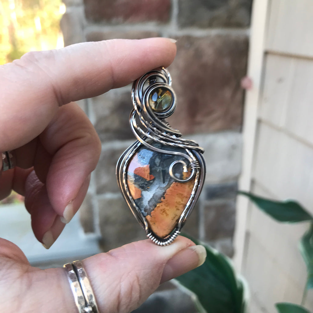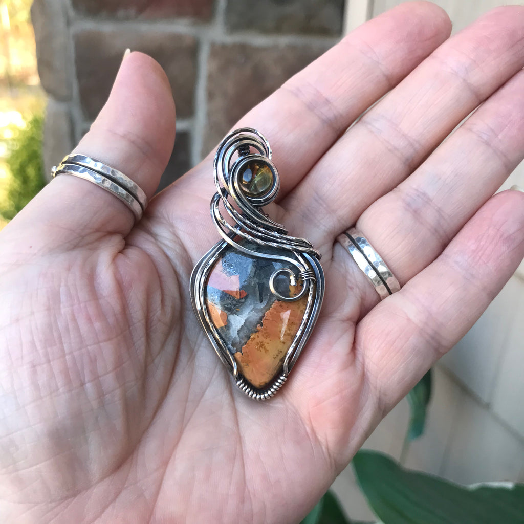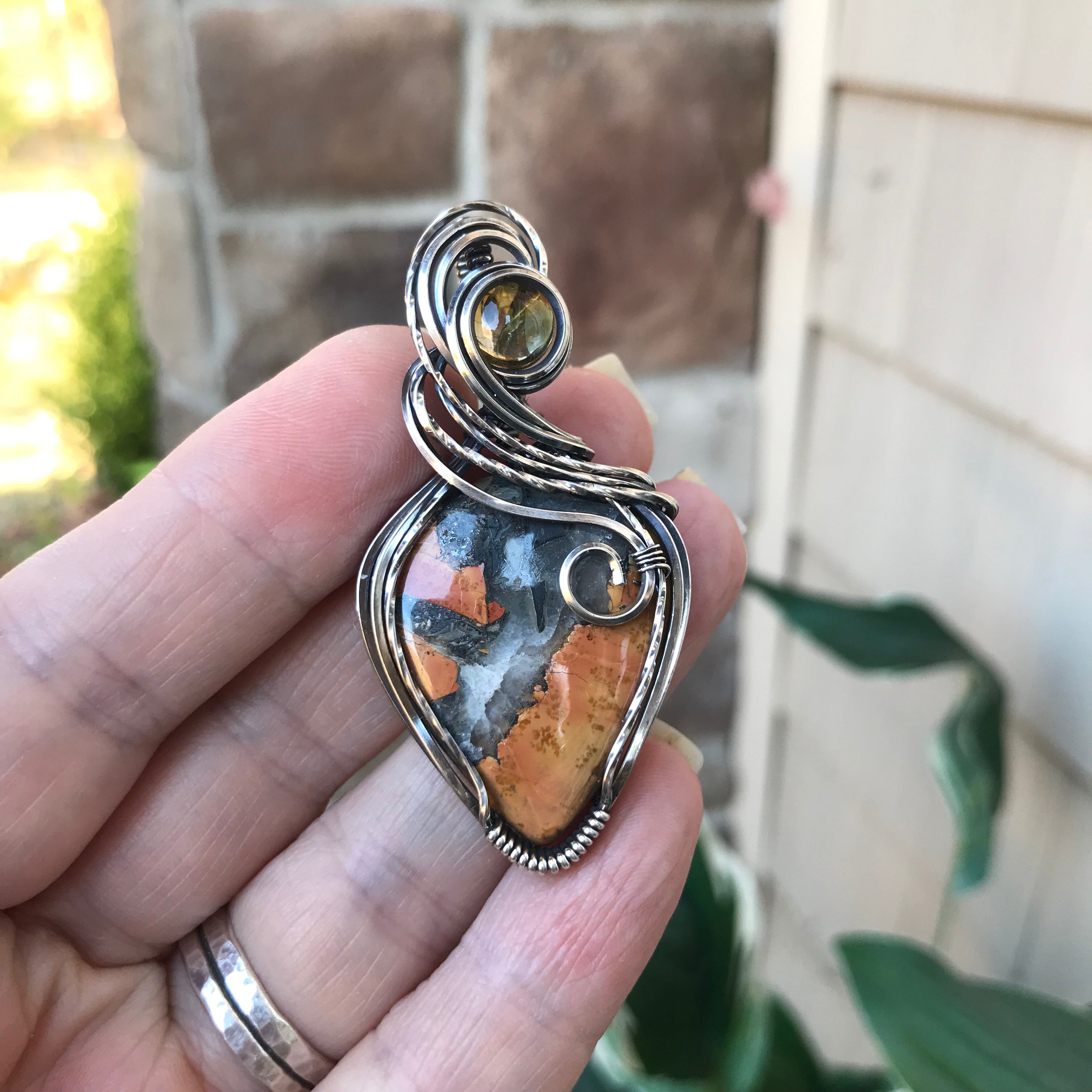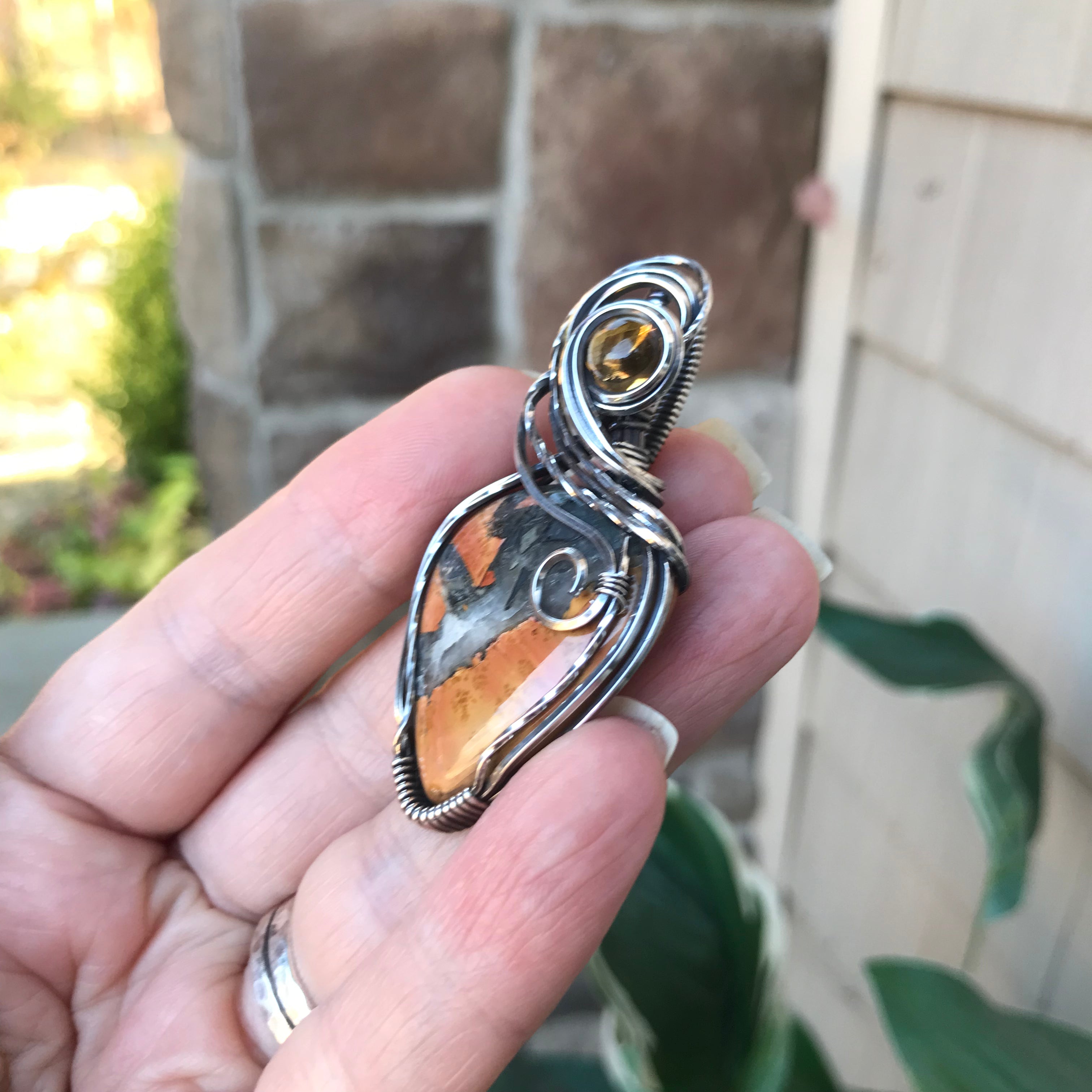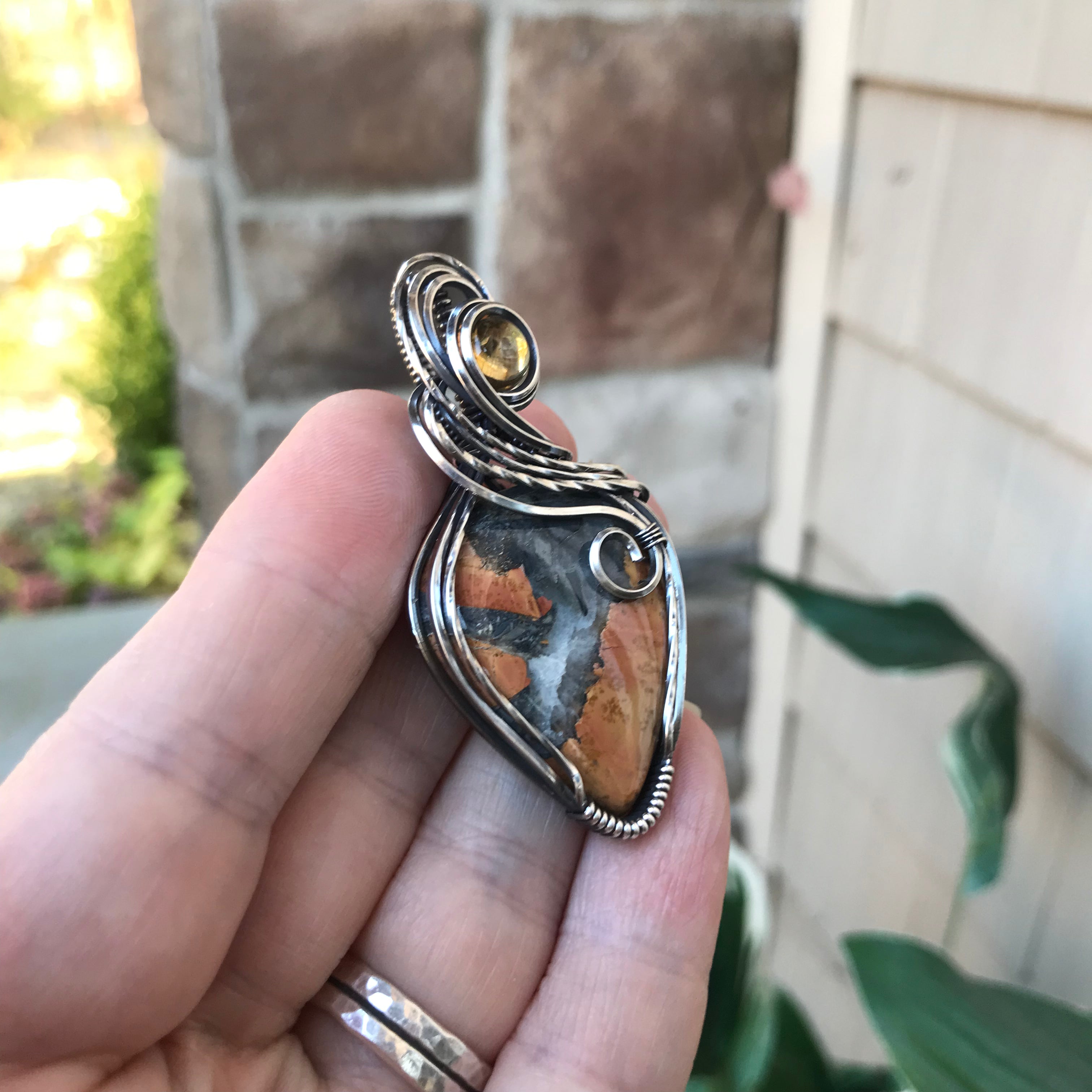 A beautiful Maligano jasper with a golden citrine accent at the top and swirls and curves that wrap around.