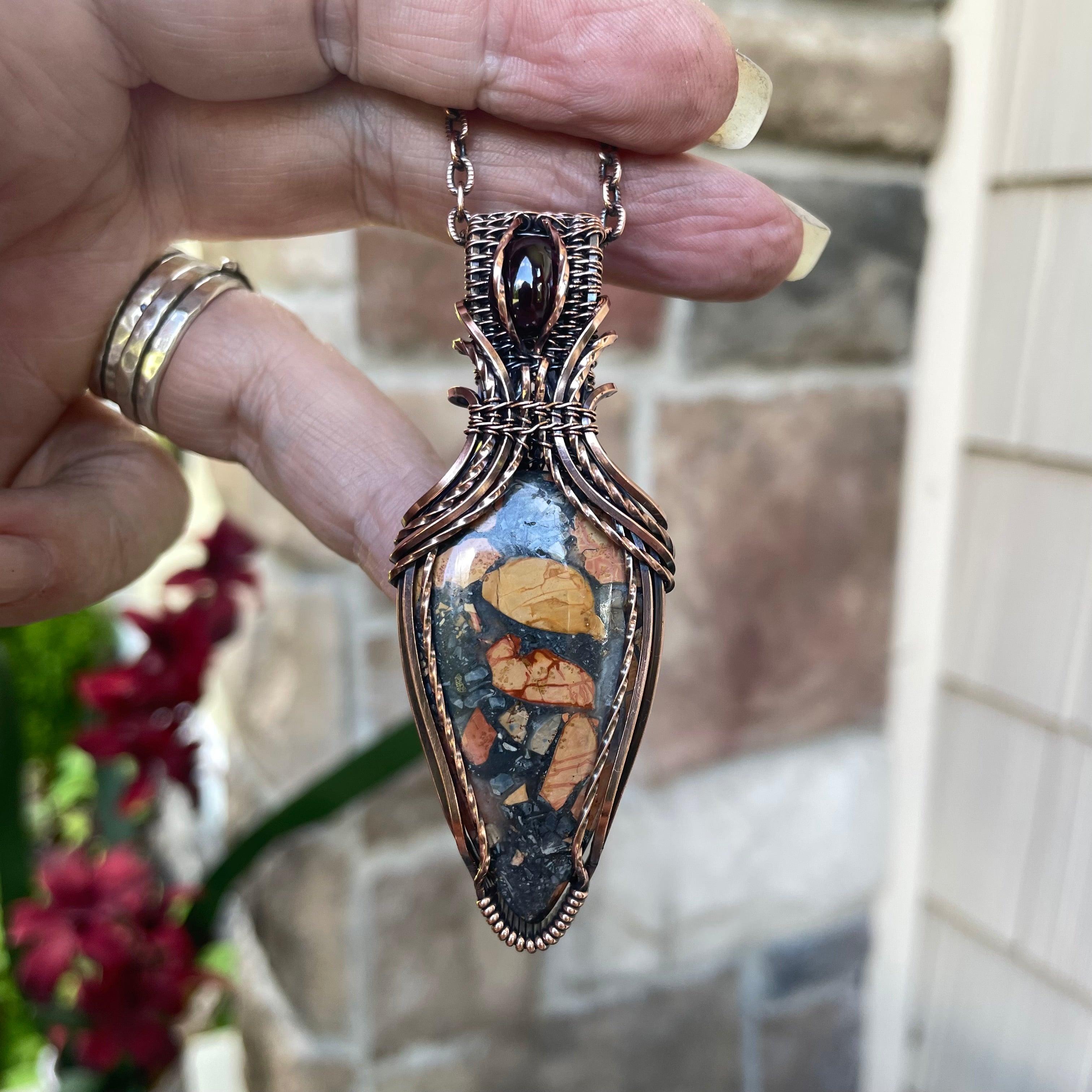 Maligano Jasper & Garnet Copper Pendant with Weaving