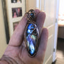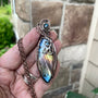 This is a gorgeous rainbow labradorite marquis shaped pendant in copper measuring 3 inches x 1 inches. I’ve added a shimmery blue labradorite accent in with the swirls.