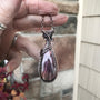 A lovely pink, mauve and golden orange a mber labradorite pendant with maroon hues and a cascading curve design. I’ve added a flared woven bail (where the chain goes through). The pendant measures approx. 2 3/4 x 7/8 inches and comes with oxidized copper chain options.