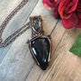 A stunning black onyx druzy in copper measuring 2 7/8 x 1 1/4 inches. The bail is woven with a prasiolite accent at the top.