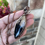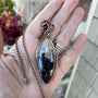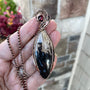 A rich and earthy petrified palm wood/root pendant (aka Bird's Eye agate) measuring at 3 inches tall and 1 inch wide. I've added a garnet accent nestled within the swirl. This marquis shaped fossilized palm wood is a beautiful combination of blue splashes and black, beige and tan for a truly warm and earthy vibe.
