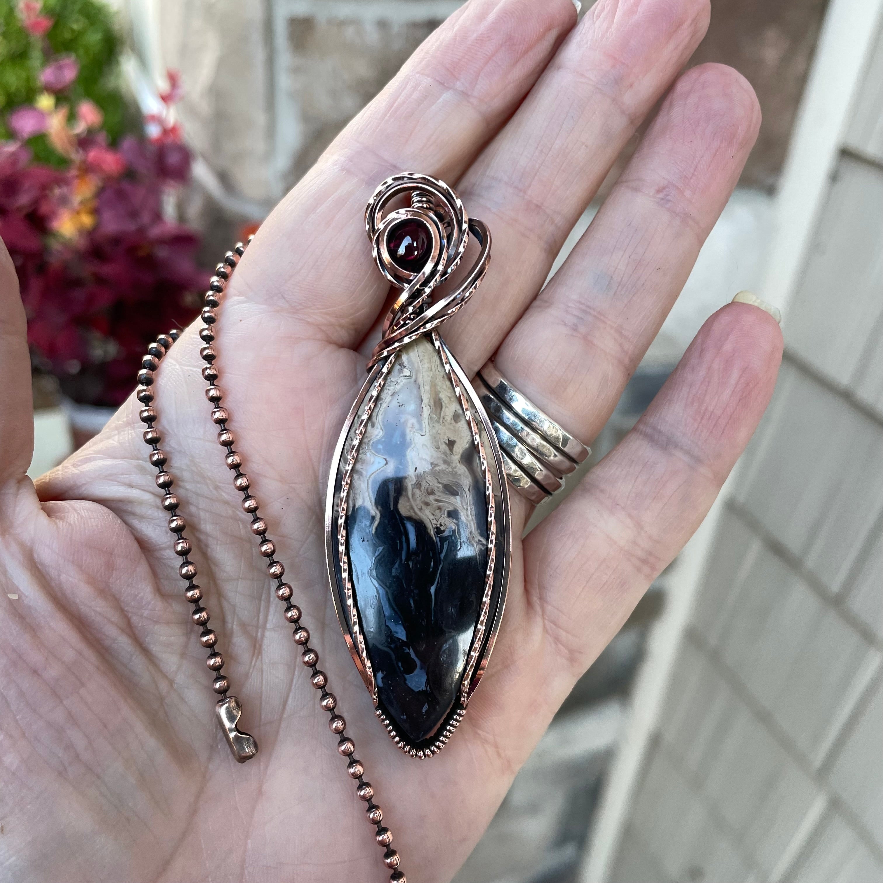 Petrified Palm Root & Garnet Marquis Copper Necklace