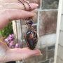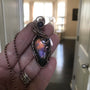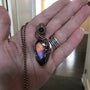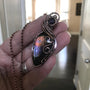 A gorgeous purple and amber labradorite that shines best in indirect light. It measures 2 1/4 inches x 1 inch at the widest point. I've added swirls at the top with an amethyst nestled inside. The copper is oxidized to give an antique, vintage look.