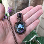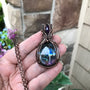 A vibrant and beautiful blue and purple labradorite pendant with an amethyst accent at the top. It has hues of dark blue also at different angles. The pendant measures 2 1/4 x 1 1/4 inches and comes with oxidized copper chain options.