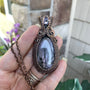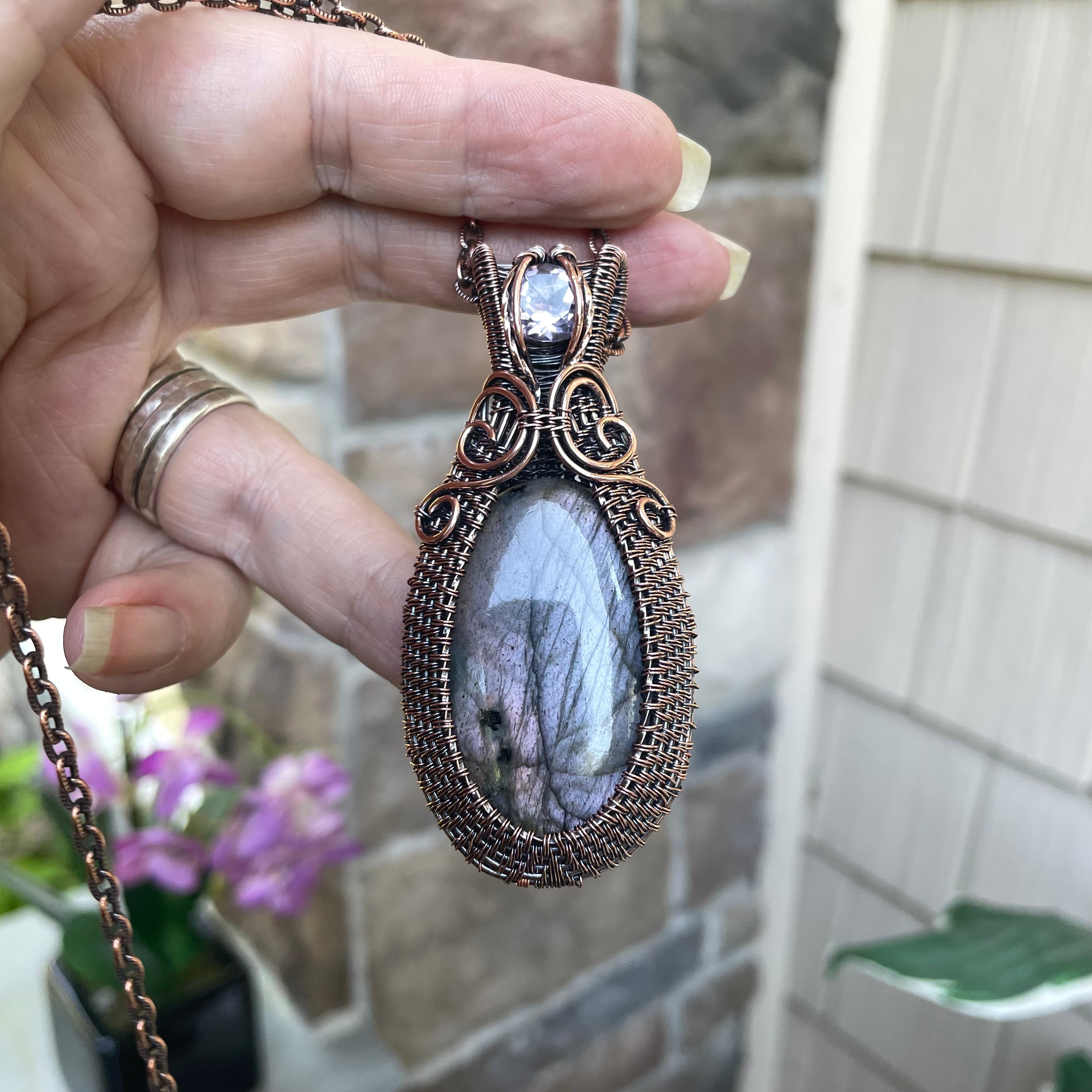 Purple Lavender Labradorite with Pink Amethyst Woven Copper Pendant