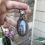 A shimmery lavender purple labradorite measuring 3 inches tall and 1 1/4 inches wide. This stunner is framed in a patterned wire weave with a sparkly high grade faceted pink amethyst at the top.