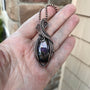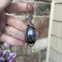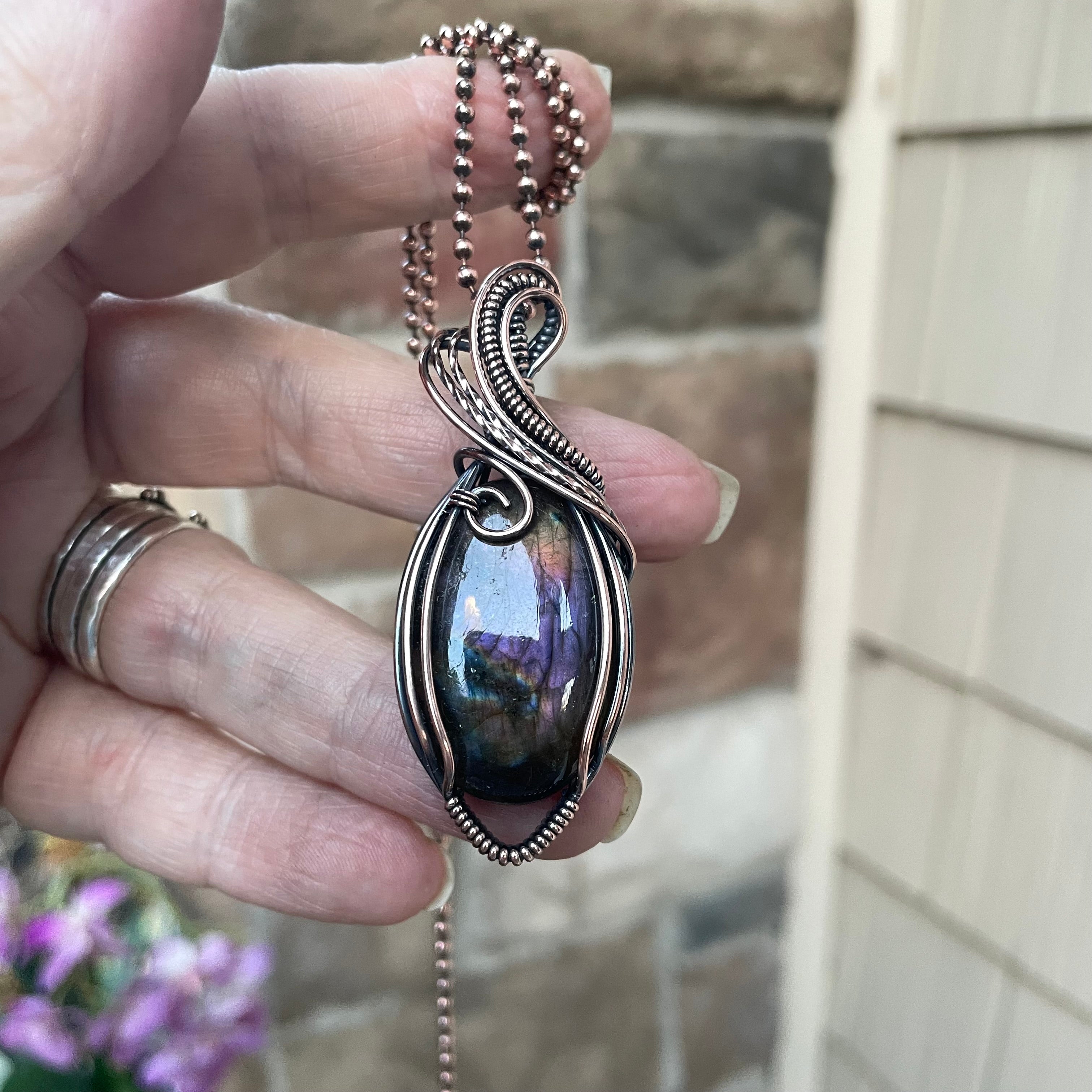 This is a beautiful oval purple labradorite with amber and splashes of rainbow colors. It measures 2 1/4 inches x 1 inches at the widest point. I've added textured curves at the top. The copper is oxidized to give a vintage old world look.