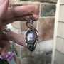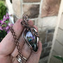 This is a stunning purple and pink labradorite with splashes of dark blue and rainbow colors. It has a curved design with cascading swirls down the side. A bit of twisted wire is threaded in. It measures 2 1/2 inches x 1 inch at the widest point. The copper is polished to a high shine and oxidized to give an antique, vintage look.