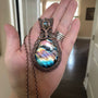 This is a very pretty colorful rainbow labradorite pendant in copper measuring 3 inches x 1 3/4 inches. I’ve added a shimmery blue labradorite accent woven into the flared bail (where the chain goes through.) It is framed in a wire weave pattern.