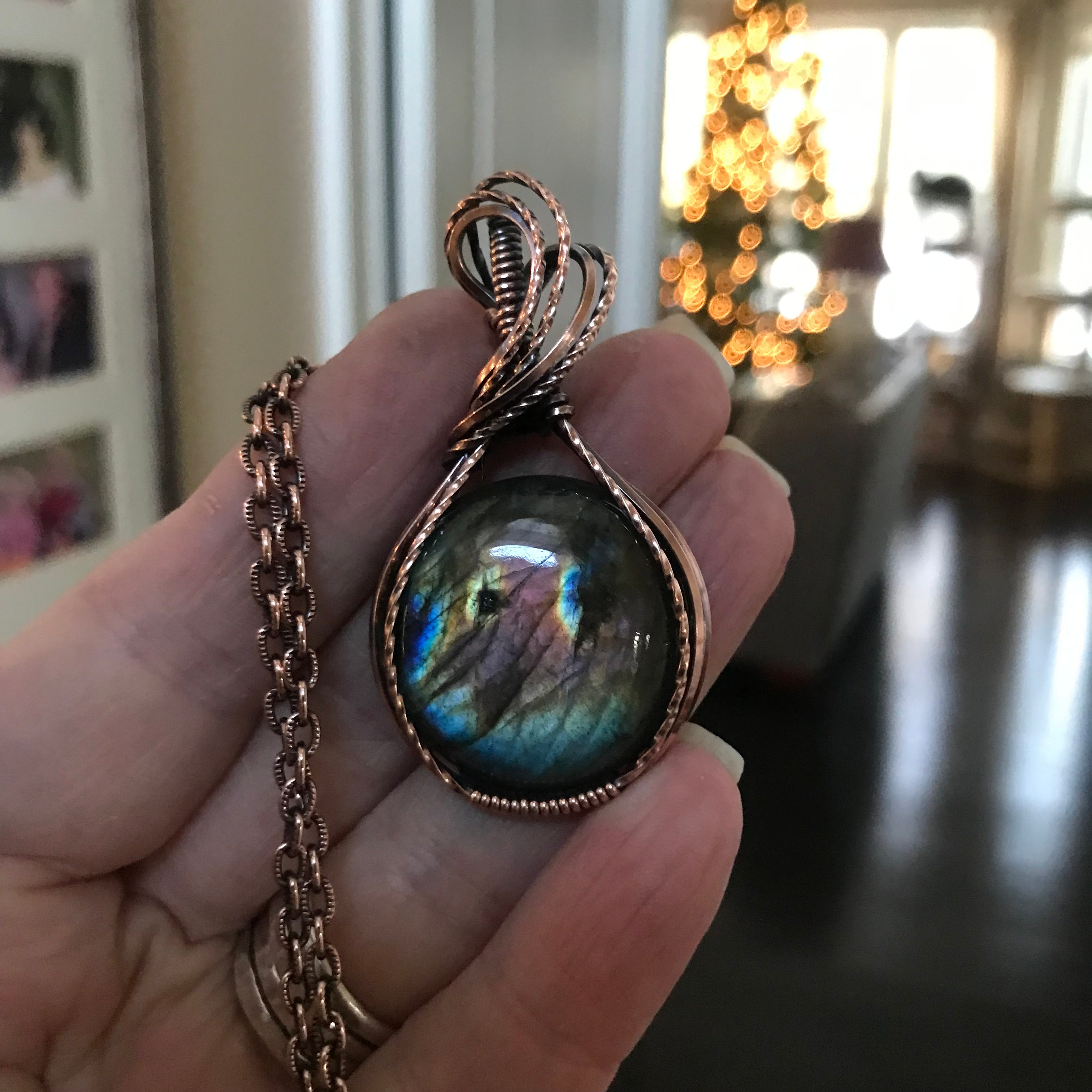 This is a beautiful rainbow labradorite that measures 2 inches x 1 inch at the widest point. I've added textured curves at the top plus twisted wire for extra sparkle. The copper is oxidized to give a vintage old world look.