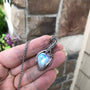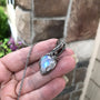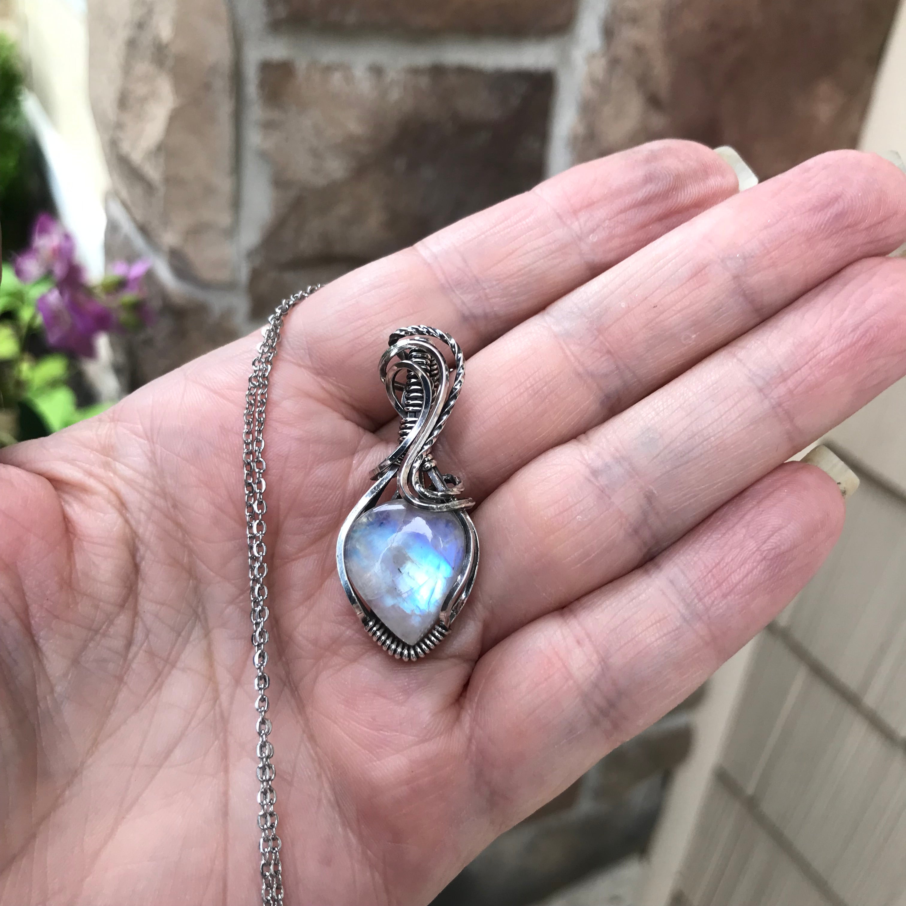 A flashy rainbow moonstone wire wrapped pendant in sterling silver. It measures 1 1/2" x 3/4". It has a blend of blue, teal and gold colors that flash at all angles. It is accented with swirls and twisted wire. Oxidization also brings out the details and gives an antique look.