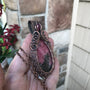 A lovely pink with black rhodonite pendant in oxidized copper. This pendant measures 3 1/4 inches x 1 1/2 inches. Framed in a woven pattern, I've added textured curves and cascading swirls plus a ruby accent stone nestled within.