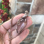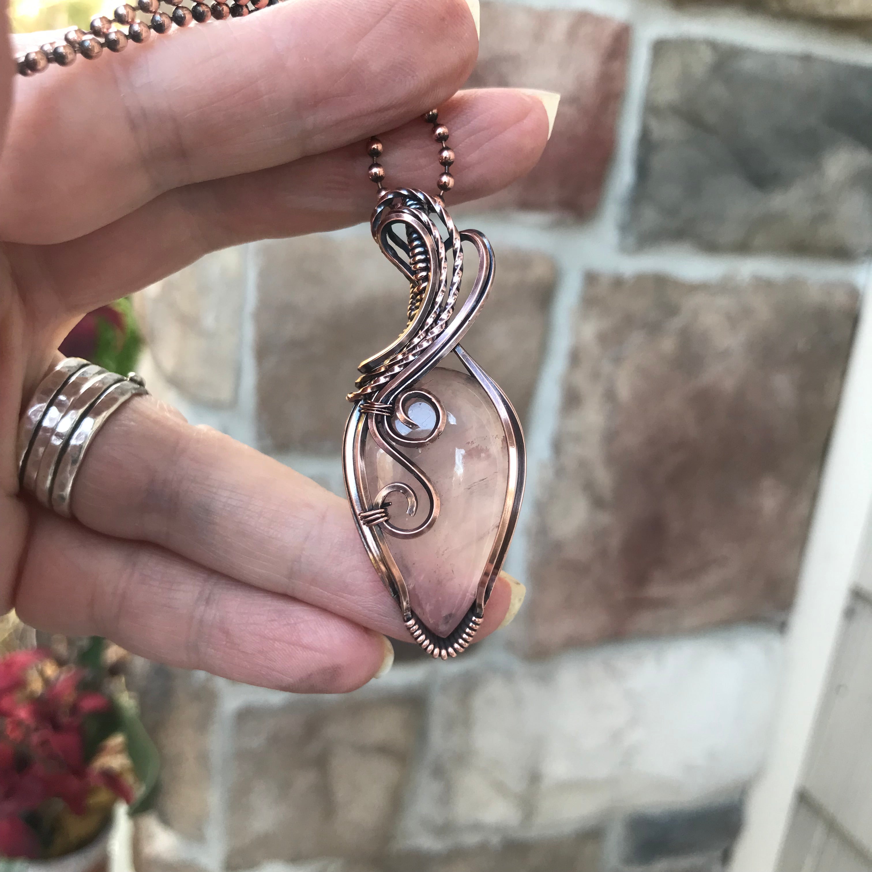 Beautiful and soothing rose quartz pendant, measuring 2 5/8 inches x 1 inch.