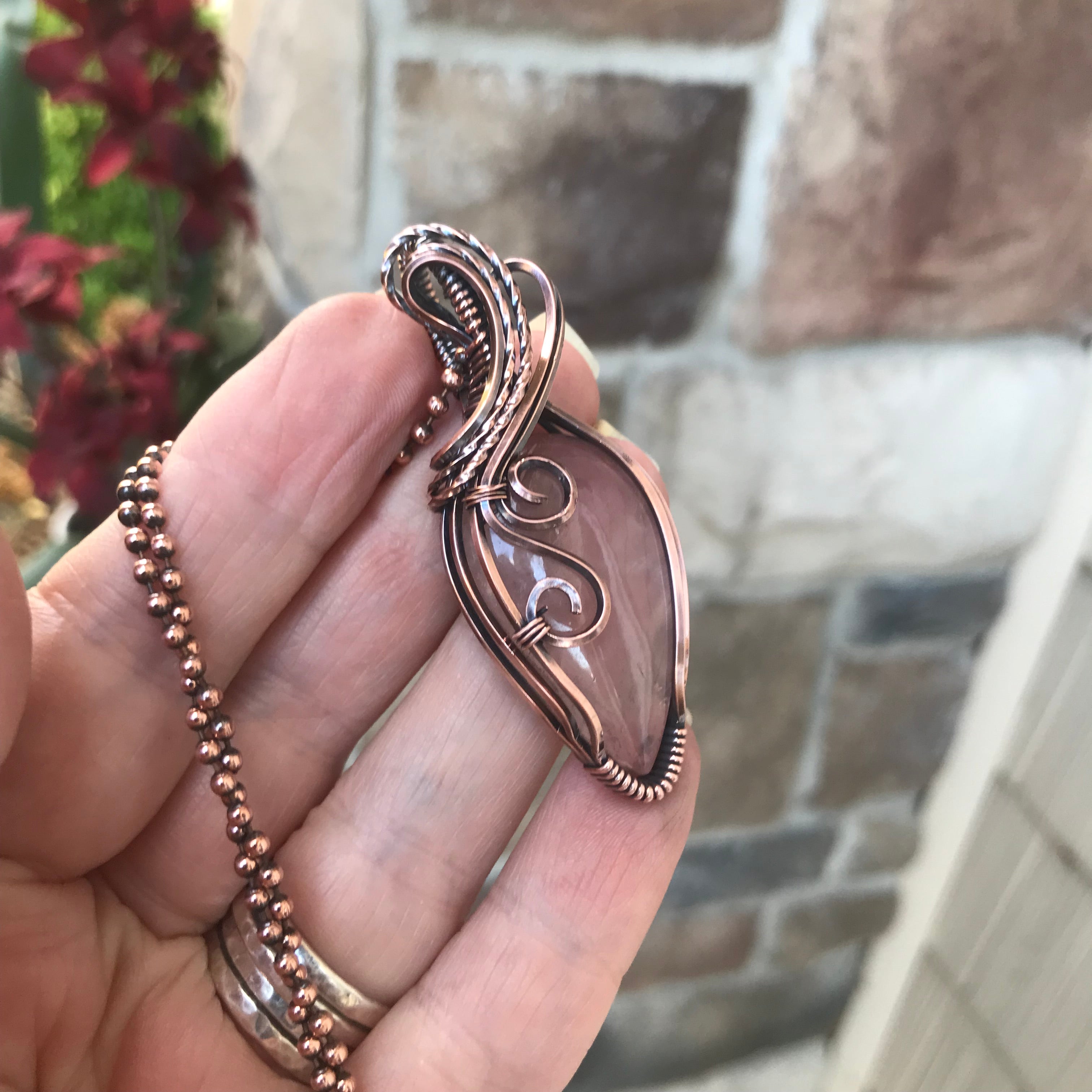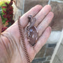 I've added a simple curved design with draping swirls and twisted wire at the top for even more sparkle. The oxidized copper, in addition to going so well with the stone, gives a vintage, antiqued look.
