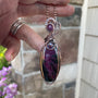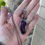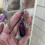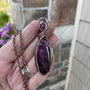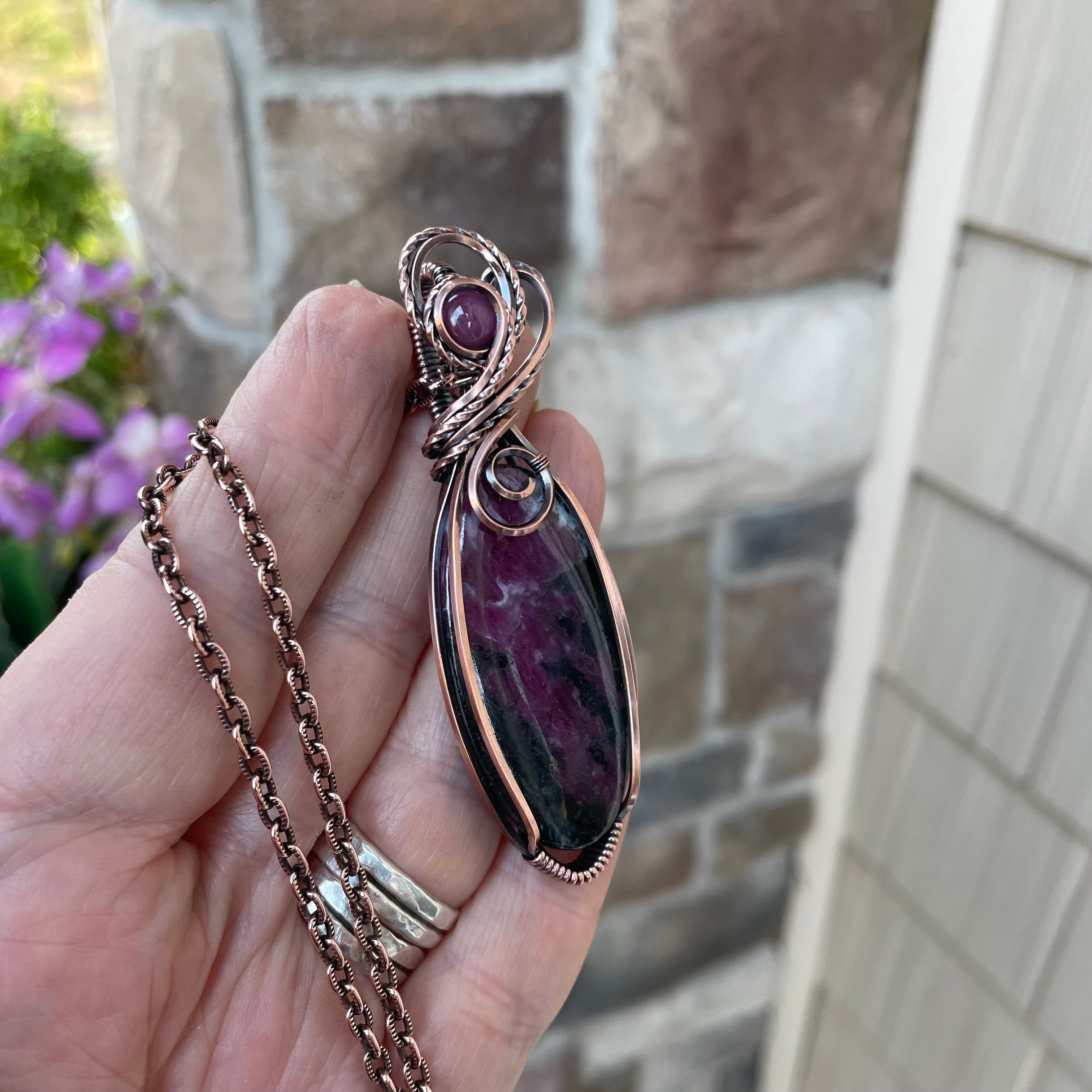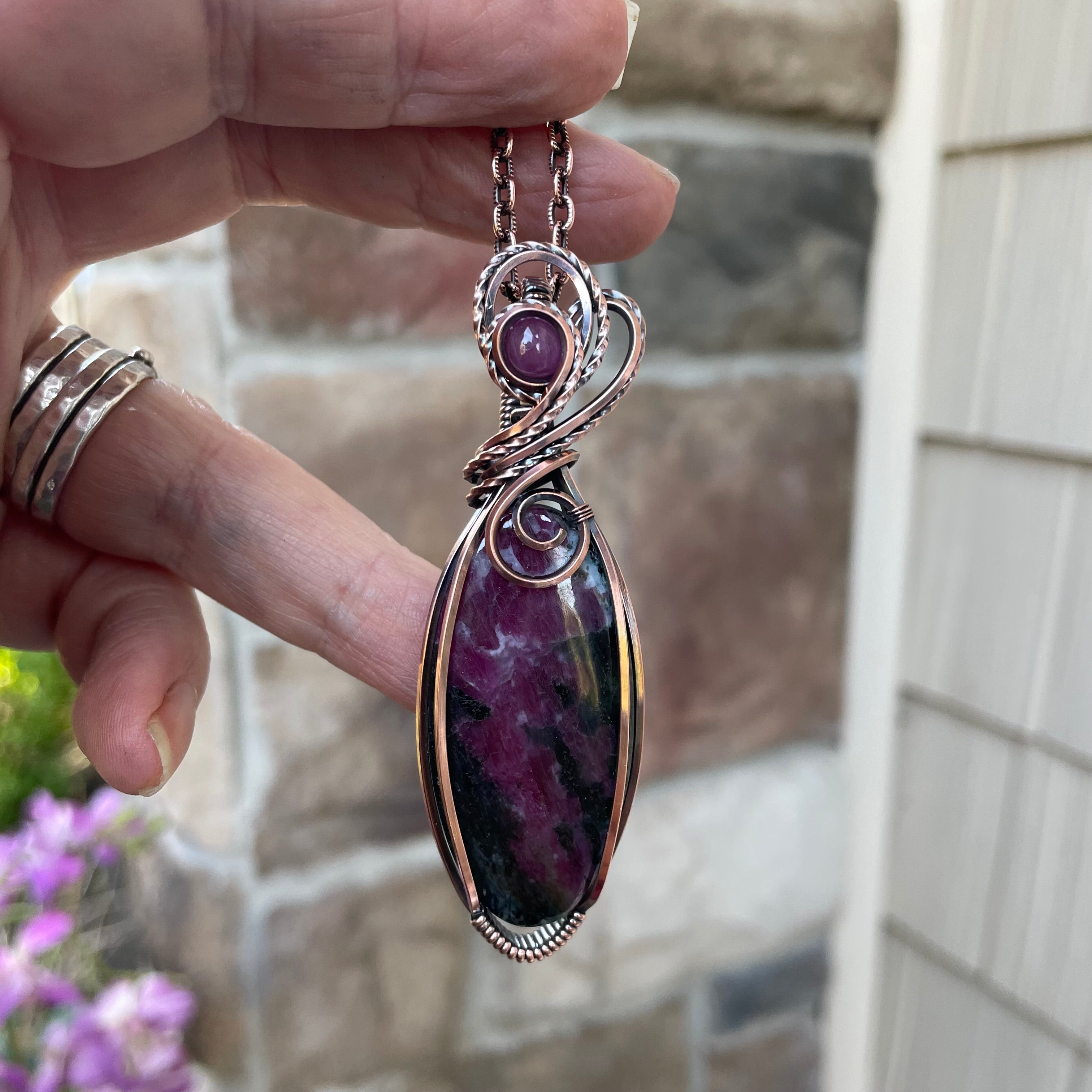 A beautiful magenta ruby pendant in oxidized copper measuring 2 3/4 inches x 1 inches. I've added twisted wire, a swirl design and a pink sapphire accent at the top. Swirls drape down the side of the slender oval pendant.