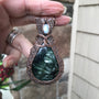 A beautiful seraphinite with a moonstone accent that measures 2 1/2 inches tall and 1 1/2 inch wide. It is framed in a thick wire weave. Oxidized copper chain options are included.