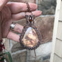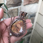 A gorgeous shimmery golden sunstone wire wrapped pendant measuring 3 inches x 1 1/2 inches. I’ve added an amber accent at the top. Oxidized copper chain options are included. The colors shimmer at every angle.