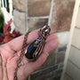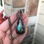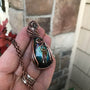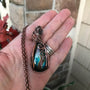 This is a lovely teal blue labradorite with purple and maroon. It's got cascading swirls down the side. It measures 2 1/2 inches x 1 inches at the widest point. The copper is oxidized to give an antique, vintage look.