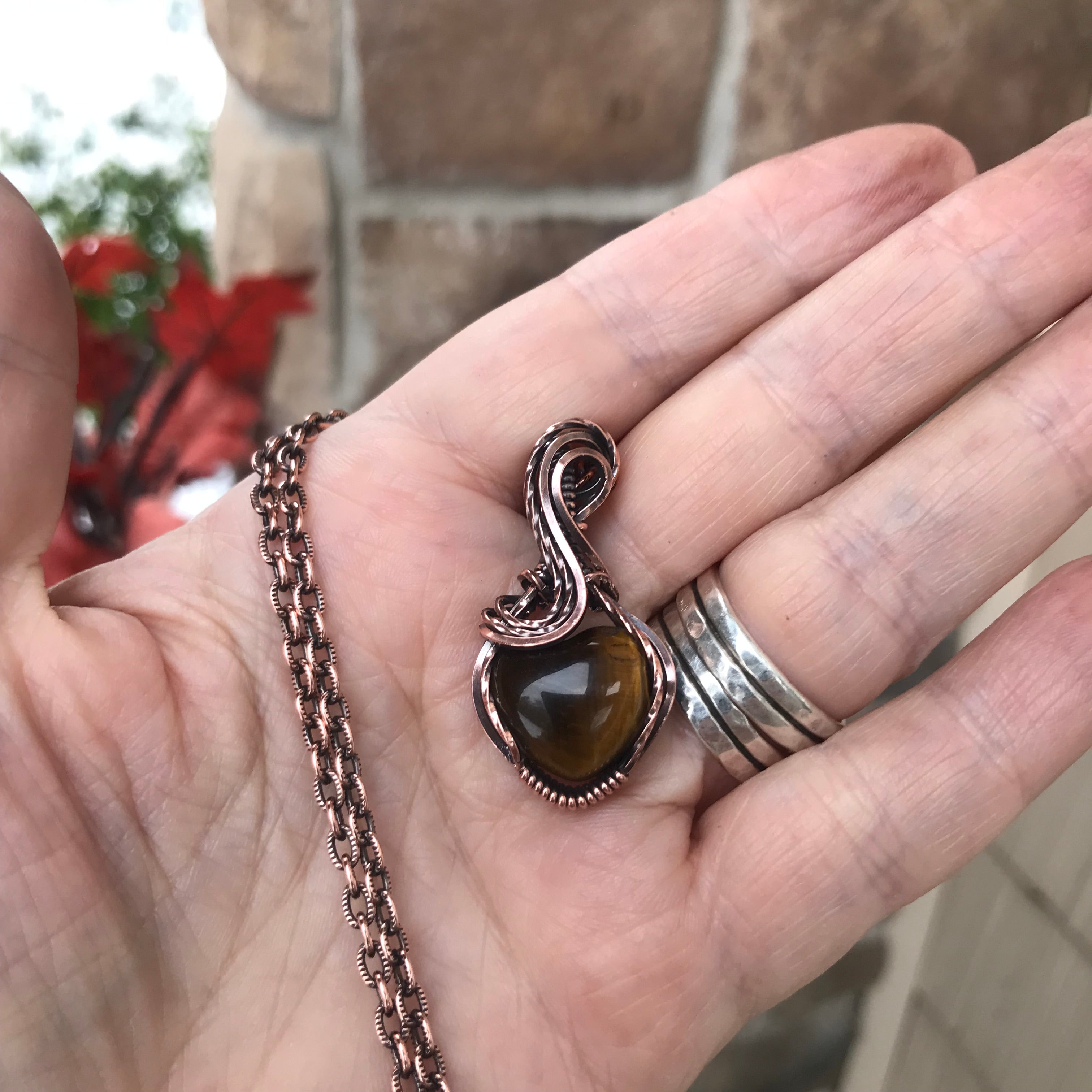 Tiger's eye is a member of the quartz family. This is a rich chatoyant tiger’s eye heart shaped pendant measuring at approx. 1 1/2 inches tall and 3/4 inch wide. I've added twisted wire on the front for even more sparkle as well as a simple curved design.